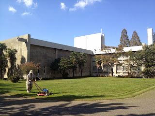 職員の釘さんが、高校生をもてなすため、芝生をカットしてくださっています!芝生のい〜い香り!